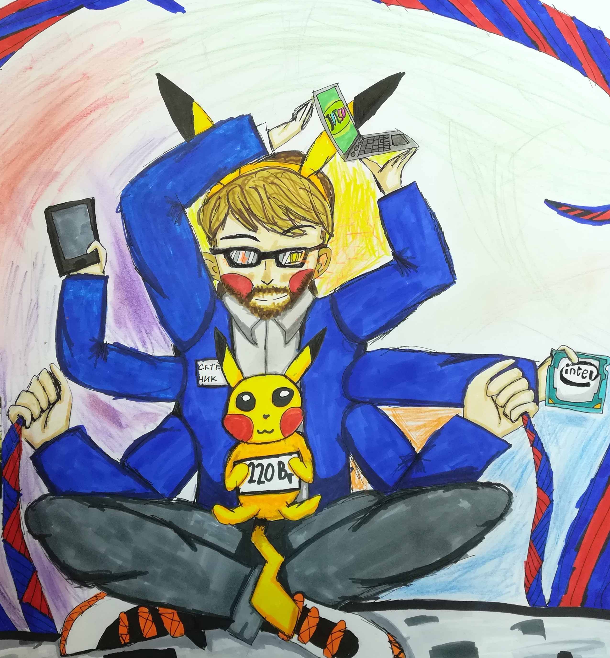 Маскот Сетеник ...Имя персонажа происходит от слияния слов «сетевой» и «никнейм». Это спокойный, уверенный в себе, дружелюбный, ироничный, продуктивный, увлеченный и умный персонаж. Он изображен многоруким не случайно: сегодня мы окружены огромным количеством информации и технологий, за всем нужно успевать - отслеживать появление новинок в софте и железе, общаться с друзьями, учиться, смотреть видео и читать, осваивать программирование или попробовать себя в киберспорте
