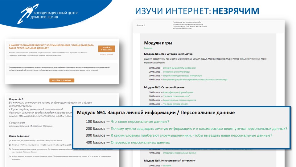 В модуле доступно обучение по десяти темам «Как устроен компьютер», «Сетевое общение», «Как устроена всемирная сеть», «Защита личной информации и персональные данные», «Искусственный интеллект», «Большие данные», «Интернет-культура», «Кто управляет интернетом» и другие. Количество тем и заданий ежегодно пополняется. За два года проектом успели воспользоваться 1,5 детей и подростков.