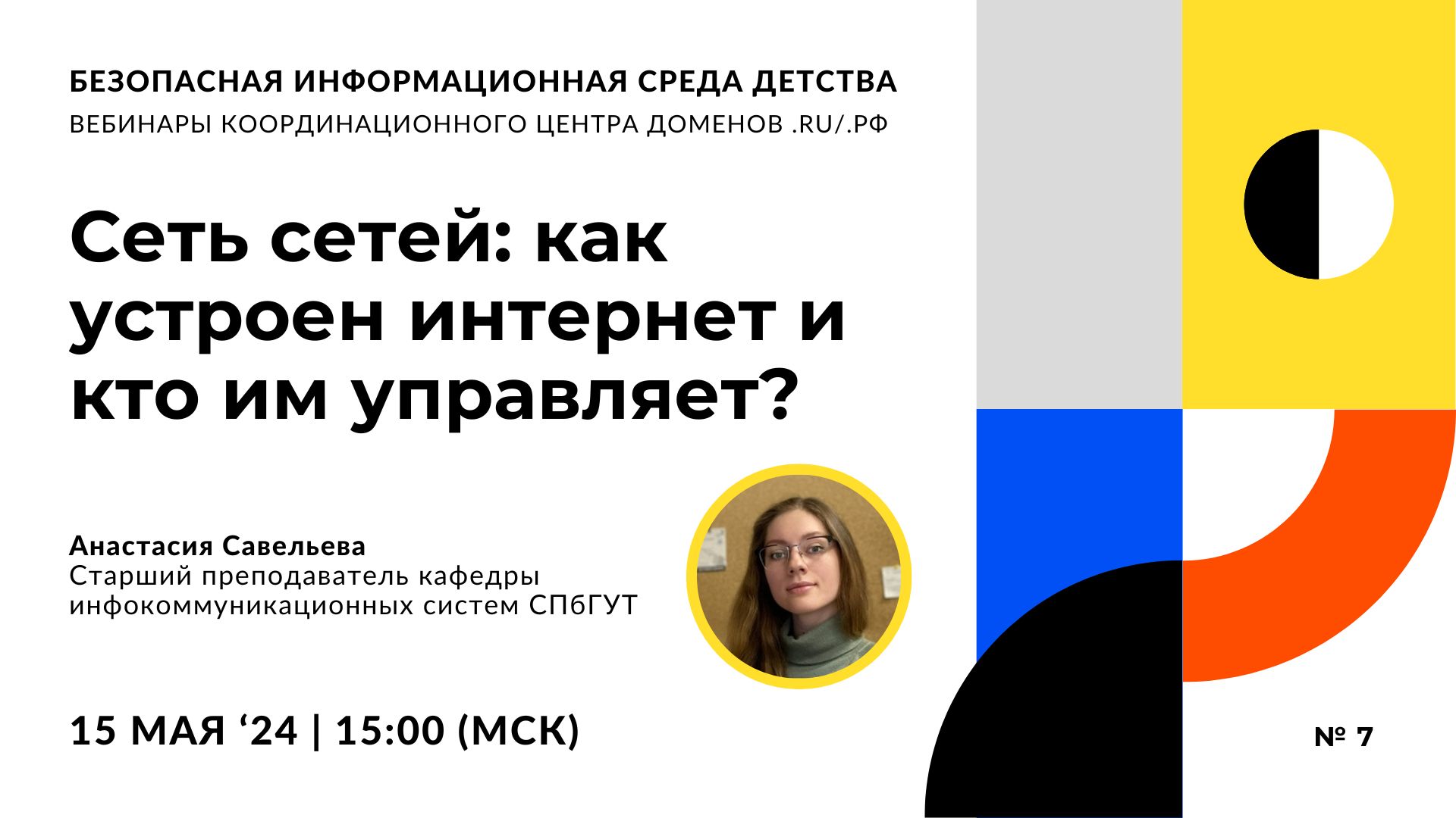 15 мая в 15:00 (МСК) на VK-площадке проекта «Безопасная информационная среда детства» пройдет седьмой вебинар Координационного центра .RU/.РФ «Сеть сетей: как устроен интернет и кто им управляет», который является логичным продолжением прошлой встречи, где крупным планом рассматривалась одна из главных составных частей интернета – домен.