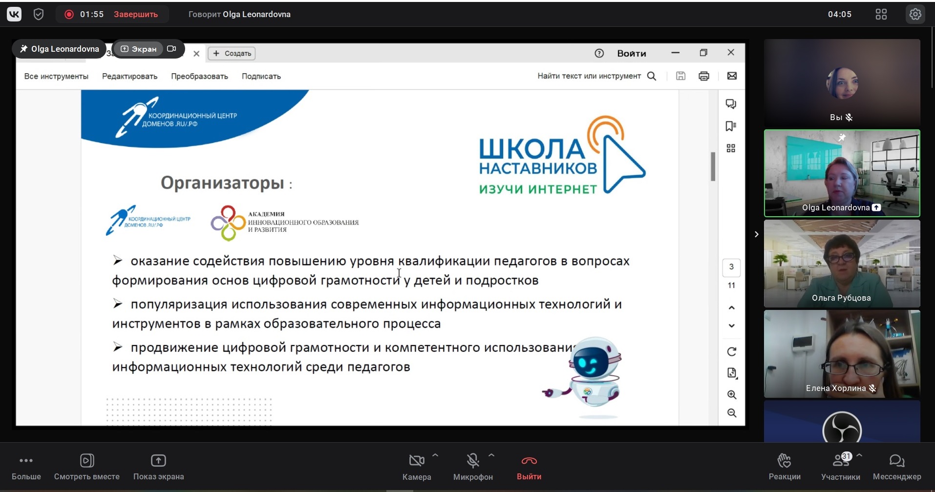 «За время реализации проекта «Изучи интернет», мы поняли, что развитие цифровой грамотности школьников напрямую связано с готовностью педагогов к этому виду деятельности: чем выше уровень ИКТ-компетенций педагога, тем выше вероятность раннего приобщения учащихся к цифровым технологиям, осознанное использование ими цифровых сервисов, инструментов, цифрового контента для решения конкретных практических задач, - сказала во вступительной речи Ольга Яковлева, начальник проектного отдела Координационного центра доменов .RU/.РФ. - В рамках Года педагога и наставника мы много ездили по стране, проводили Уроки безопасного интернета, общались с учителями, узнали об их потребности улучшить цифровые навыки в широком смысле слова и в итоге решили объединить усилия с Академией и создать Школу наставников. Мы поделимся экспертизой в области управления интернетом, коллеги – в области цифровизации образования. Наша задача – дать рабочие инструменты и знания, которые можно масштабировать и передать коллегам и ученикам».